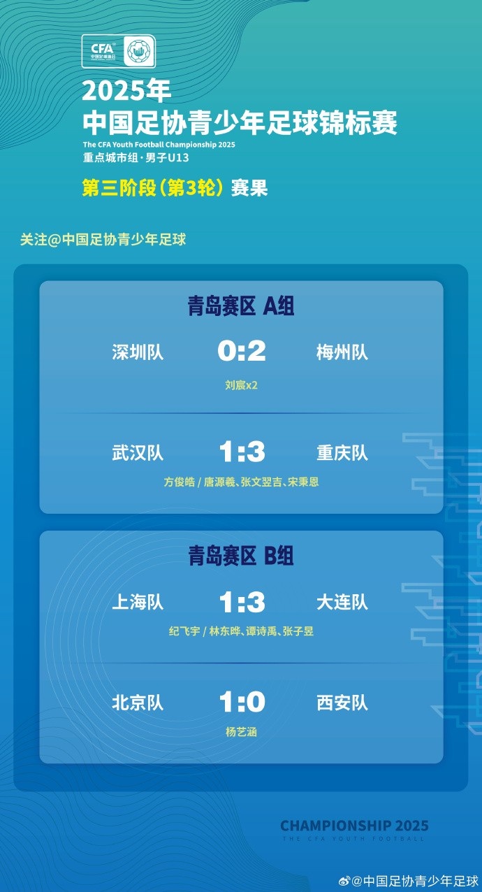 2025年中国足协青少年古代足球 冠军赛 重点城市男子U13组第三阶段第3轮赛果+积分榜 🎙️现场赌场现场赌场直播体验