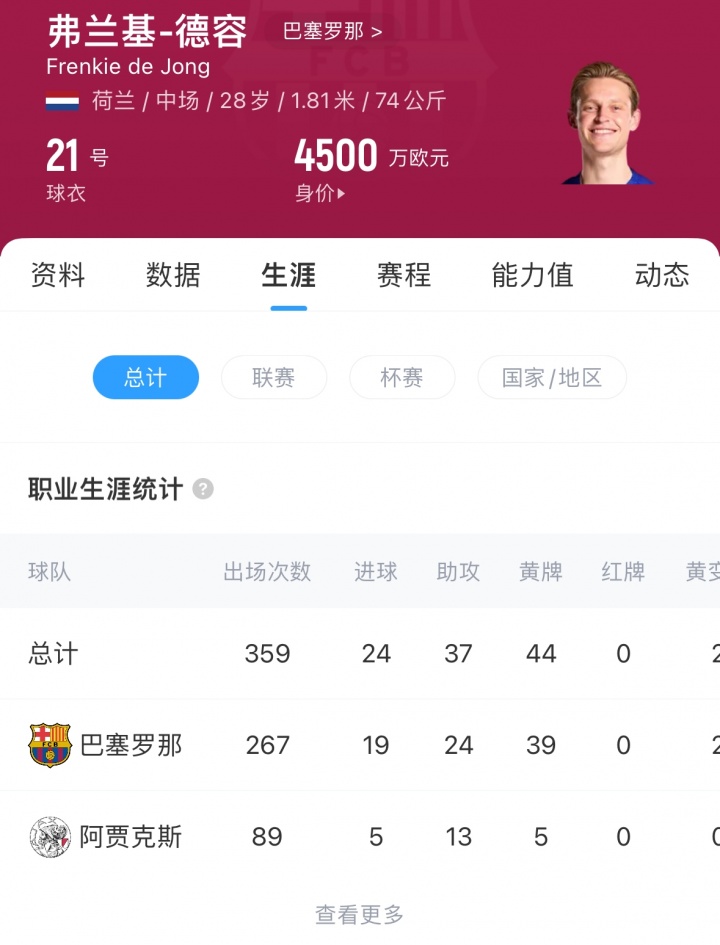 德容2019年以8600万欧转会费从阿贾克斯加盟巴萨,至今为巴萨出战267场赛事 19球24助。