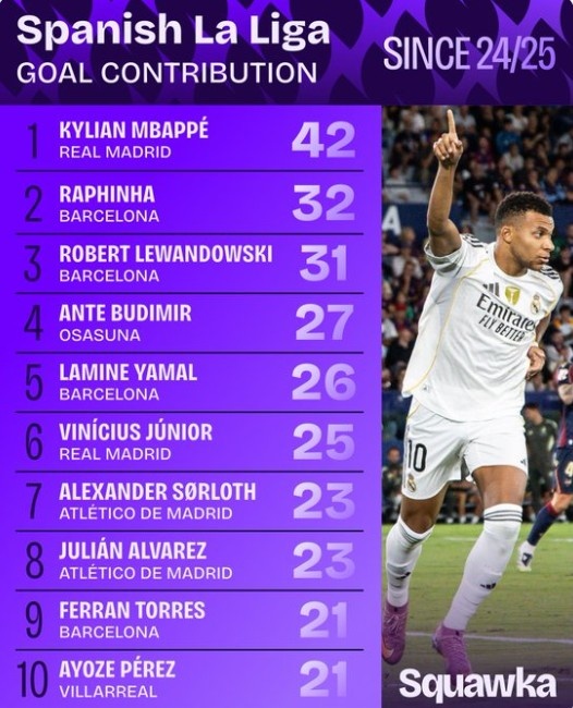 9月25日讯 本赛季,皇马射手姆巴佩延续了良好的竞技状态 ,法国人在西甲中已经打进7球。根据Squawka的数据统计 ,足球直播无插件免费在线观看上赛季以来,姆巴佩在西甲直接加入 42球位居榜首。