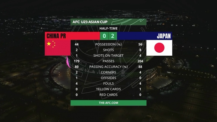 半场U23国足0-2追赶 日本U23,欧洲杯直播吧半场U23国足盘带时间 44%,U23日本盘带时间 56%。
