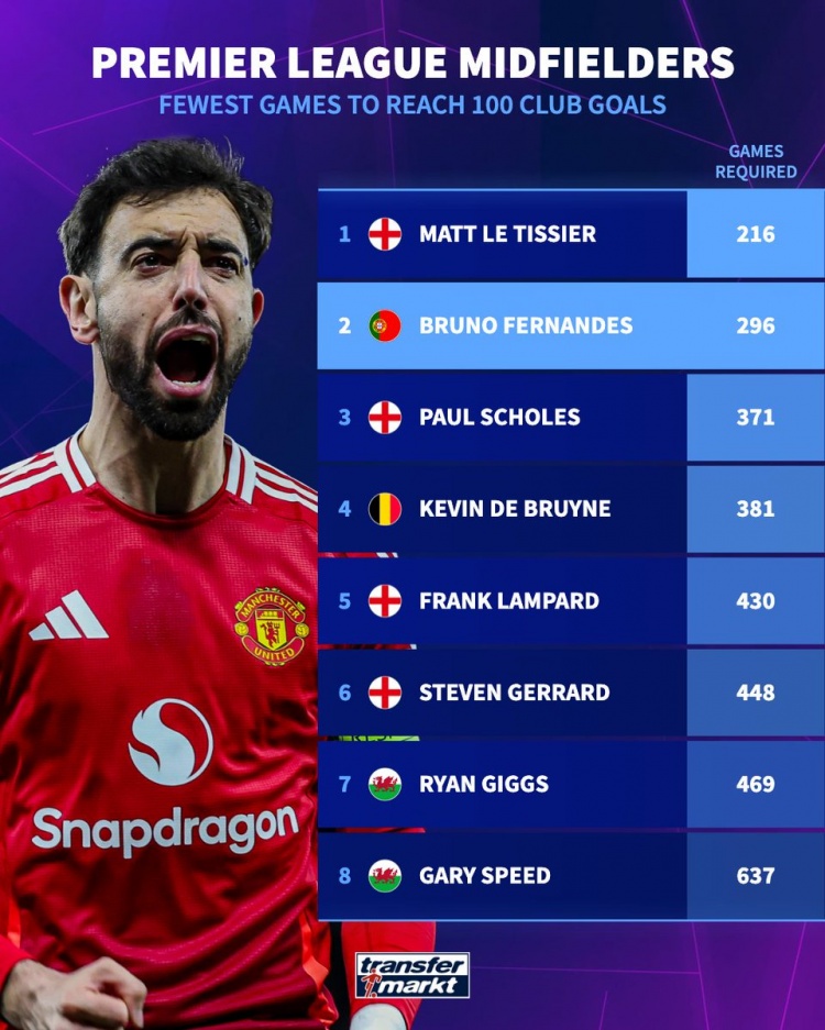 据德国转会市场统计,欧洲杯直播B费已为曼联打进100球,英超时代只有8名中场球员球员为俱乐部(所有赛事)打进100球,而B费是所用场次第2少的中场球员球员。