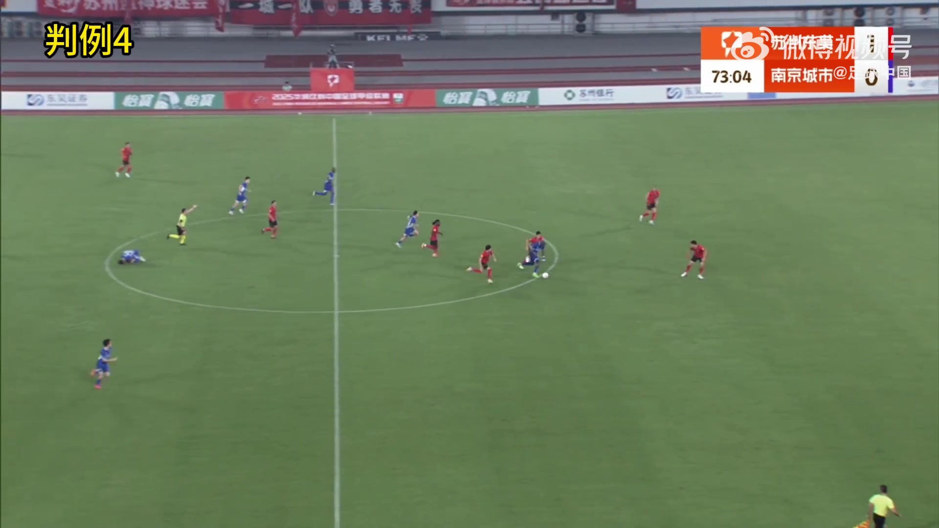 判例四:中甲职业联赛 第24轮,苏州东吴vs南京城市。赛事 第74分钟,苏州东吴29队员违例 后倒地不起,南京城市2号队员过来用手接触苏州东吴29号面部,裁判 员向南京城市2号出示驱逐 罚令出场。
