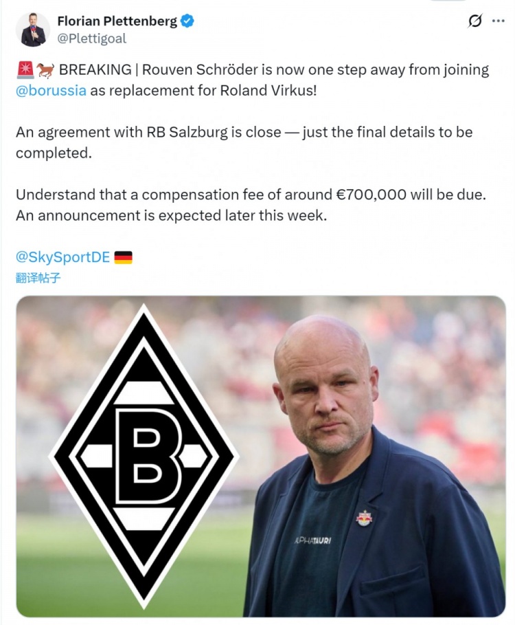 媒体指出,门兴有意聘请萨尔茨堡总监施罗德,让其成为俱乐部的新任总监,以替代离任的维尔库斯,免费欧洲杯直播门兴接近与萨尔茨堡达成协议,只剩最后细节有待敲定,补偿金约为70万欧,预计本周晚些时候官宣。