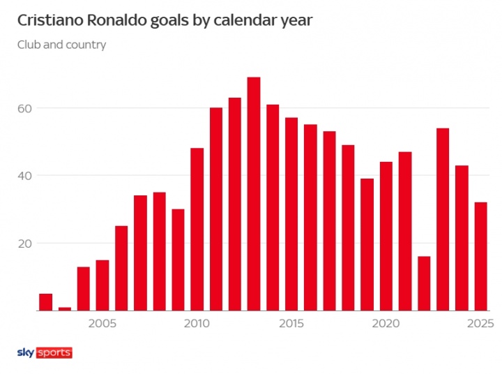 2025年,欧洲杯直播吧C罗已经在俱乐部和国家队攻入32球,自2010年以来,C罗平均每年得分 数超过50个,过去15年里,他的年度总得分 数只有一次低于39个。那是在2022年,那一年他攻入了16粒得分 。