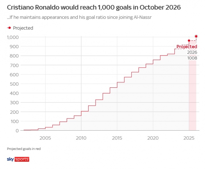 天空体育最近的预测显示,根据C罗目前的得分 效率,他预计将在2026年10月成为历史上第一位得分 数达到1000的球员。