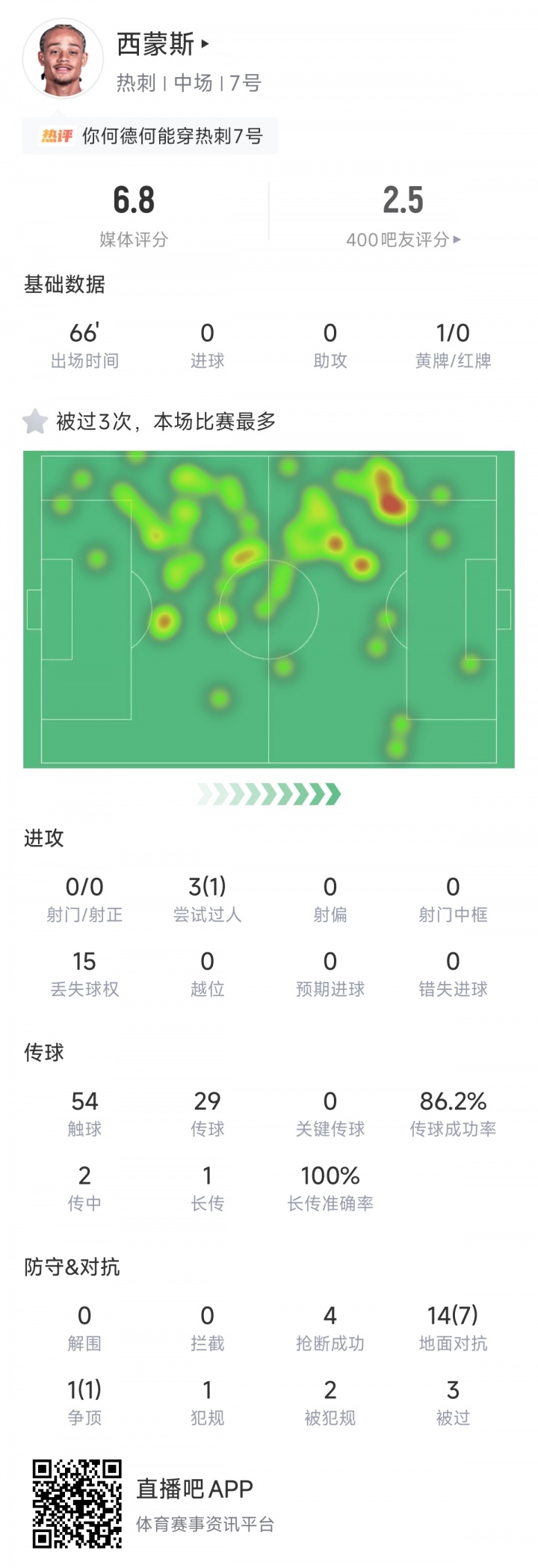 22岁的西蒙斯昨晚第7分钟后备 登场,换下脑震荡的贝里瓦尔。但是他出战66分钟表现不佳,被过3次+15次丢球权,传送球 成功率86.2%。在第73分钟他被换下。