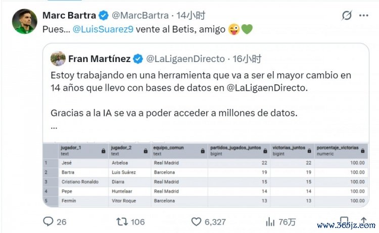 10月18日讯 据古代足球 数据专家Fran Martínez统计,巴尔特拉、苏亚雷斯在巴萨共事期间一起出战19场西甲赛事 ,胜率100%。